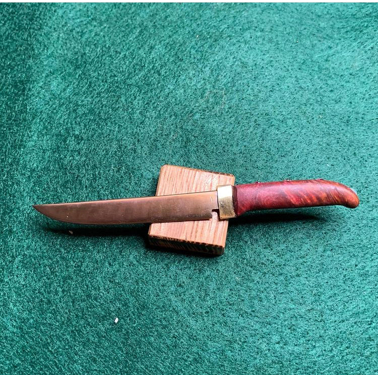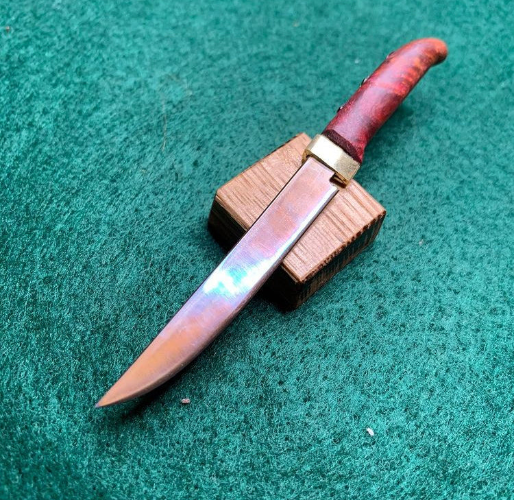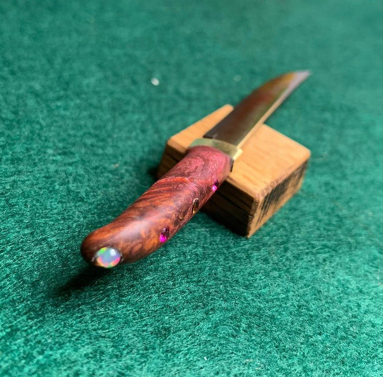 This piece has a single bevel stainless blade that has multiple finishes including an acid dip, and a 2 tone flame anodizing to bring out purple and gold hues! The handle is multi dyed amboyna sap burl with 2x 2mm rubies and 1x 3mm opal inlaid!