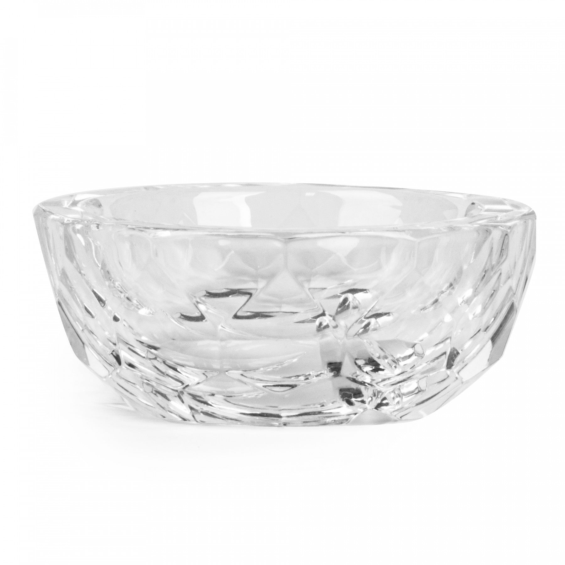 Glass oil dish with directional cuts on the underside, to be used as a carb cap.