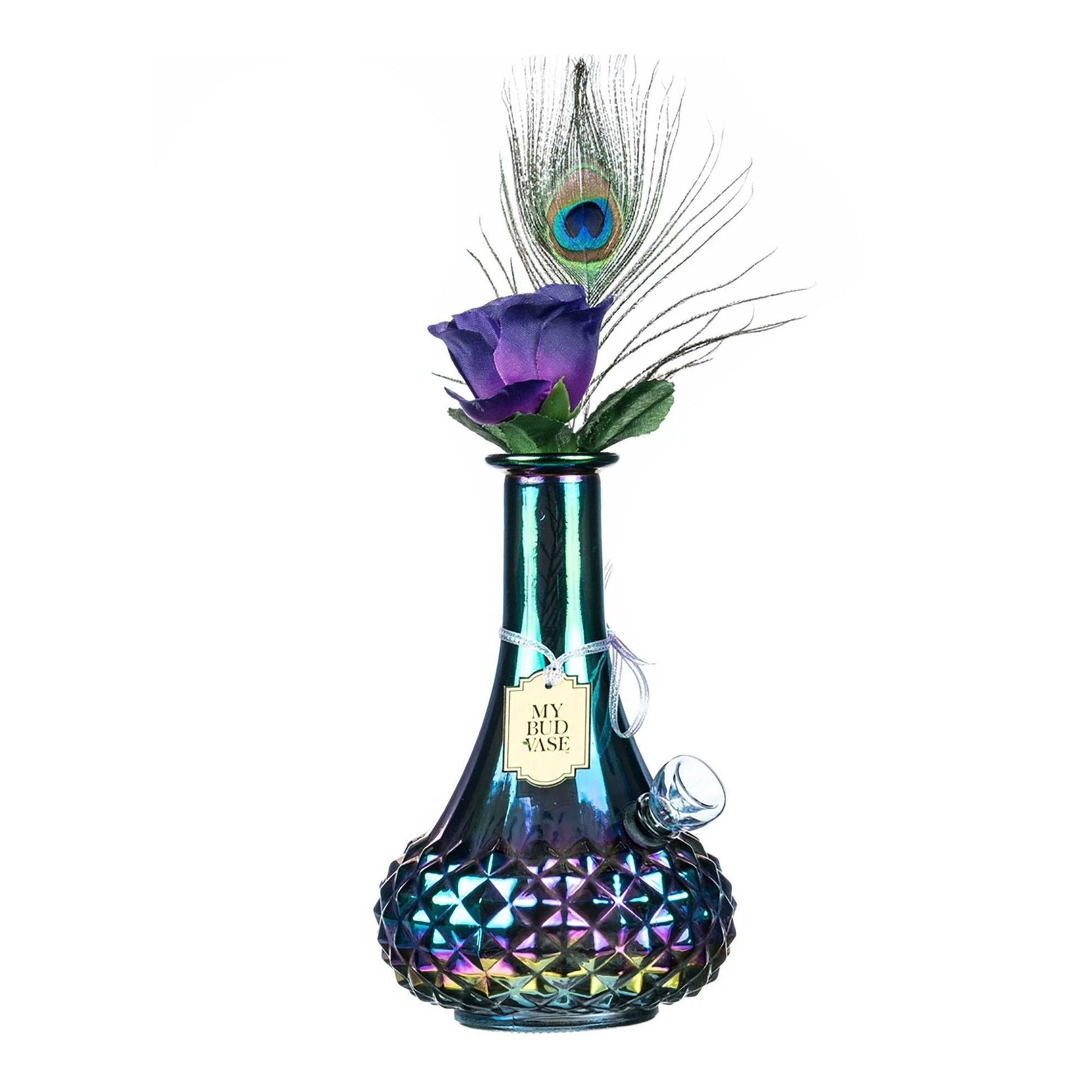 The brilliant minds at My Bud Vase have created a genre of bongs like you've never seen before. This "Aurora" Water Pipe is both elegant and functional. The colors seen all throughout this piece are inspired by the Aurora Borealis, otherwise known as the Northern Lights. This piece has a beautiful shimmer that runs up and down the glass for a truly unique look. This piece features a genie-like shape that allows you to add a large amount of water for better filtration. This bong has a rubber grommet joint that houses a fixed downstem that extends into the chamber. This piece includes a purple tinted glass bowl for dry herbs that fits perfectly in the rubber grommet joint. When you're not using this piece, throw the flower and peacock feather back in the top and remove the bowl and you have a beautiful centerpiece. This is one water pipe you won't need to hide from anybody.